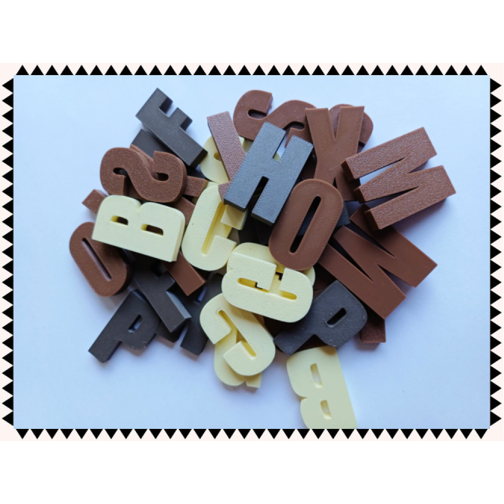 In een zakje zitten 6 verschillende chocoaldelettertjes in de 'smaken' puur, wit en melkchocolade.