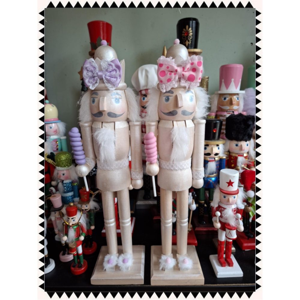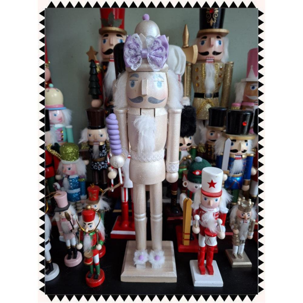 Een notenkraker in een witte parelmoer kleur. Versierd met roze accessoires en witte kant. Formaat: Hoogte