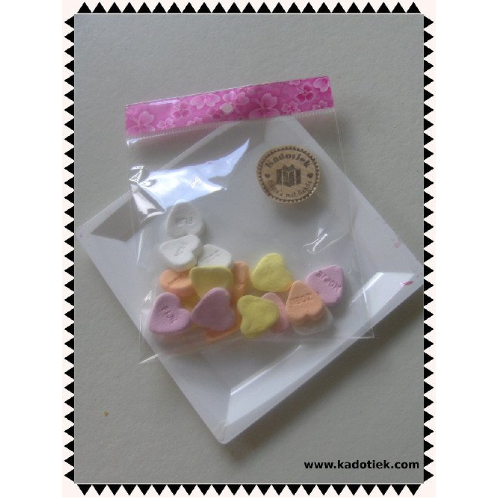 Op ieder hartje staat een tekst afgedrukt. In een zakje zitten 16 hartjes.